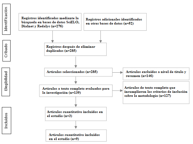 Se establecieron criterios de inclusión a los 328 artículos que se procesaron con la metodología PRISMA, quedando nueve artículos en total, cuyo proceso fue abordar directamente la relación entre la reflexión y la contextualización pedagógica en el contexto de la innovación educativa, como también que hayan sido desarrolladas en metodologías cuantitativas y cualitativas revisados por pares ciegos; los artículos que se excluyeron fueron los que no se encontraban disponibles en idioma español e inglés, así como los que no cumplían con los estándares de calidad y rigor metodológico (Fig. 1).