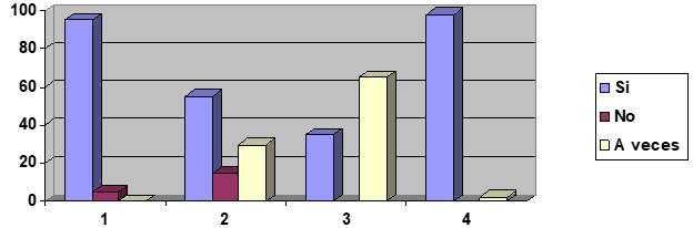 La tercera pregunta reflejó que un 65 % de los encuestados percibe que estas actividades se realizan ocasionalmente y destacan que las mismas los estimulan, motivan y distraen. Además, un 35 % opinó que estas actividades desarrollan sus habilidades y capacidades, son útiles para la vida diaria, permiten conocer más sobre diversas asignaturas y facilitan la comprensión de los contenidos. Sin embargo, reconocen que se realizan pocos experimentos y que, en la mayoría de los casos, estos son llevados a cabo únicamente por el profesor.