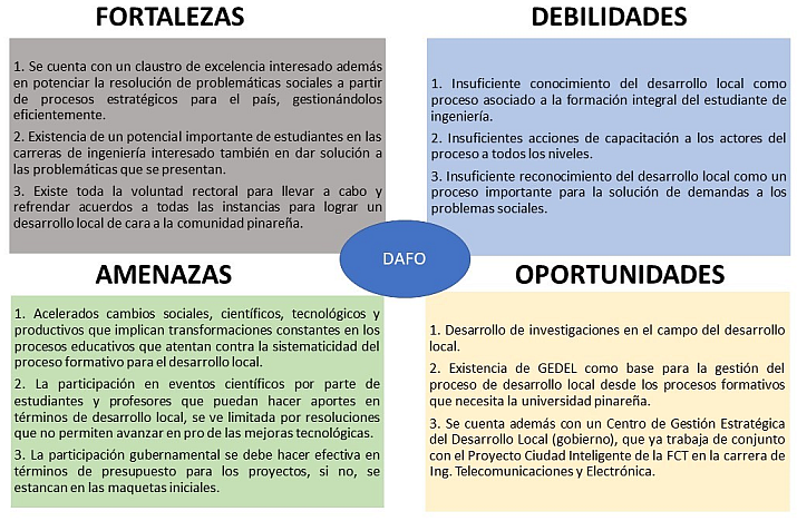 The analysis of this quadrant leads to prioritizing the training of social actors at all levels and working on the basis of a strategy that allows optimizing the training process for local development in engineering students, taking into account the opportunities of the environment to eliminate or to reduce the main weaknesses, which are related to the lack of knowledge of local development as a training process.