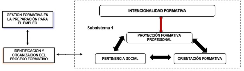 Como resultado de la interacción dialéctica entre estos componentes, surge la intencionalidad formativa como cualidad resultante del primer subsistema. Esta cualidad permite sistematizar conocimientos, consolidar valores y competencias necesarias para el desempeño del recién graduado en su puesto de trabajo (Figura 1).