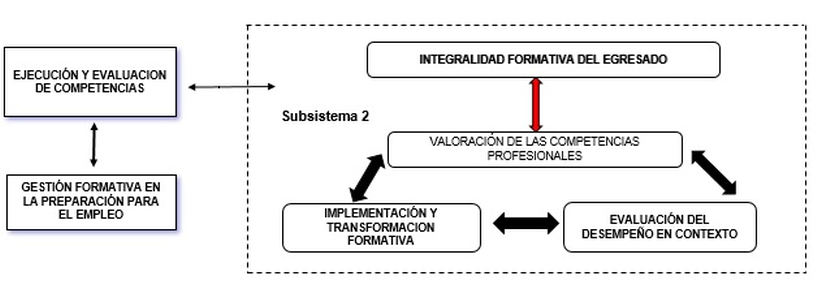Al comprender la sinergia que se revela entre el primer subsistema se asegura la entrada al segundo subsistema: Ejecución y evaluación de competencias. Este, establece una relación dialéctica de manera ascendente y superior en los elementos que se describen con respecto al subsistema anterior; que de manera recíproca en conexión con los aspectos teóricos metodológicos propuestos en el subsistema anterior. Su expresión trasformadora emana nuevos componentes: Implementación y transformaciones formativas, evaluación del desempeño en contexto y valoración de las competencias profesionales.