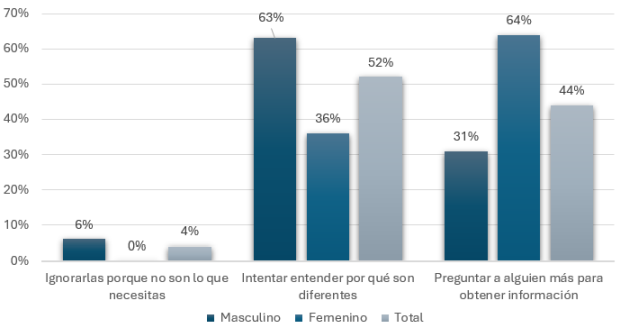 La gráfica muestra las respuestas de los estudiantes al enfrentarse a resultados inesperados en sus investigaciones. Una mayoría, el 63 % de los niños, indica que intenta "entender por qué son diferentes"; mientras que el 36 % de las niñas selecciona esta opción. Por otro lado, un 64 % de las niñas prefiere "preguntar a alguien más para obtener información", en comparación con el 31 % de los niños. Solo un 4 % del total, sin diferencias de género notables, opta por ignorar las respuestas inesperadas por no considerarlas relevantes. Estas respuestas resaltan tendencias diferenciadas en los enfoques de resolución de problemas entre los grupos estudiados (Figura 4).