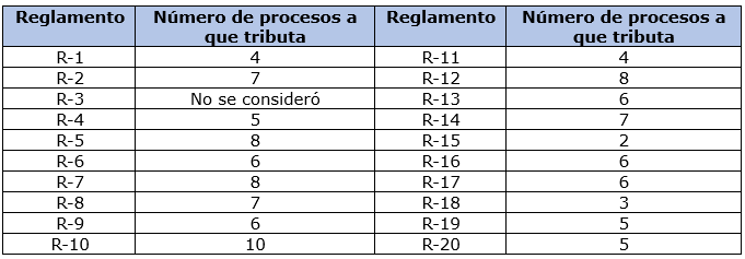 The number of functions established in the regulatory documents reviewed varies widely, ranging from 4 to 20, for an average of 10 per regulation. Likewise, the number of processes (of the 12 identified) associated with these functions also varies, ranging from 2 to 10, for an average of 5.9. The mode is 6 processes (Table 4).