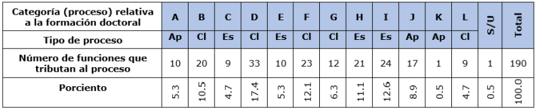 It is also observed that a significant number (121, for 63.9%) of the 190 registered functions are grouped into five of the established categories (processes): B (Curriculum management), D (Admission and registration movements: re-admissions, extensions, withdrawals), F (Doctoral research management), H (Academic staff management) and I (Internal functioning of the program management body), the first three being key processes, and the last two being strategic (Table 5).