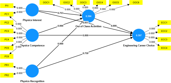 The findings also revealed that interest in physics had positive and negative, but not statistically significant, relationships with engineering career choice and extracurricular activities. Recognition in physics showed a weak, non-significant, negative relationship with career choice, although the relationship with extracurricular activities was positive and statistically significant. The explanatory power (R²) of 0.307 indicates that exogenous constructs explain 30.7% of engineering career choice. Similarly, the coefficient of determination of 0.384 (Table 7) indicates that exogenous constructs explain 38.4% of participation in extracurricular science activities.